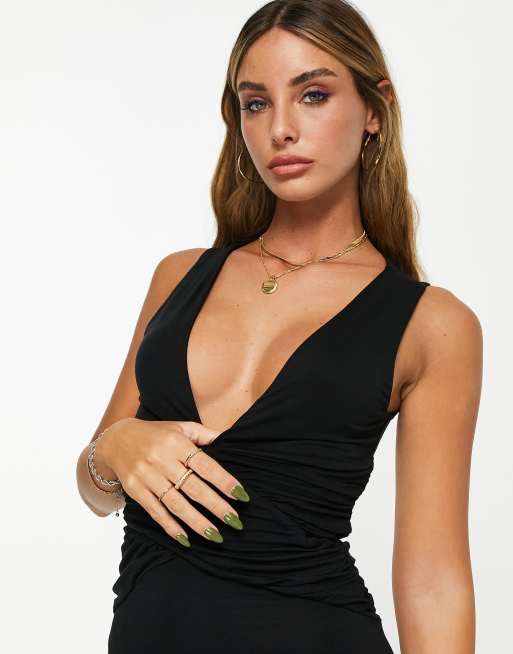 ASOS DESIGN Maxi jurk tot aan de enkels met gerimpelde taille en diep uitgesneden hals in zwart Very well made.