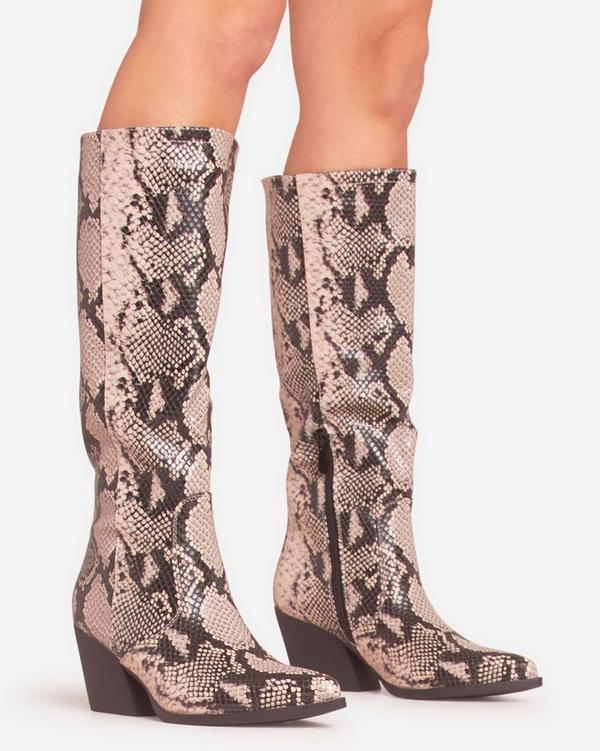 Slade Pointed Toe Block Heel Knee High Western Cowboy Boot In Black And Beige Snake Print Faux Leather EGO Very well made.