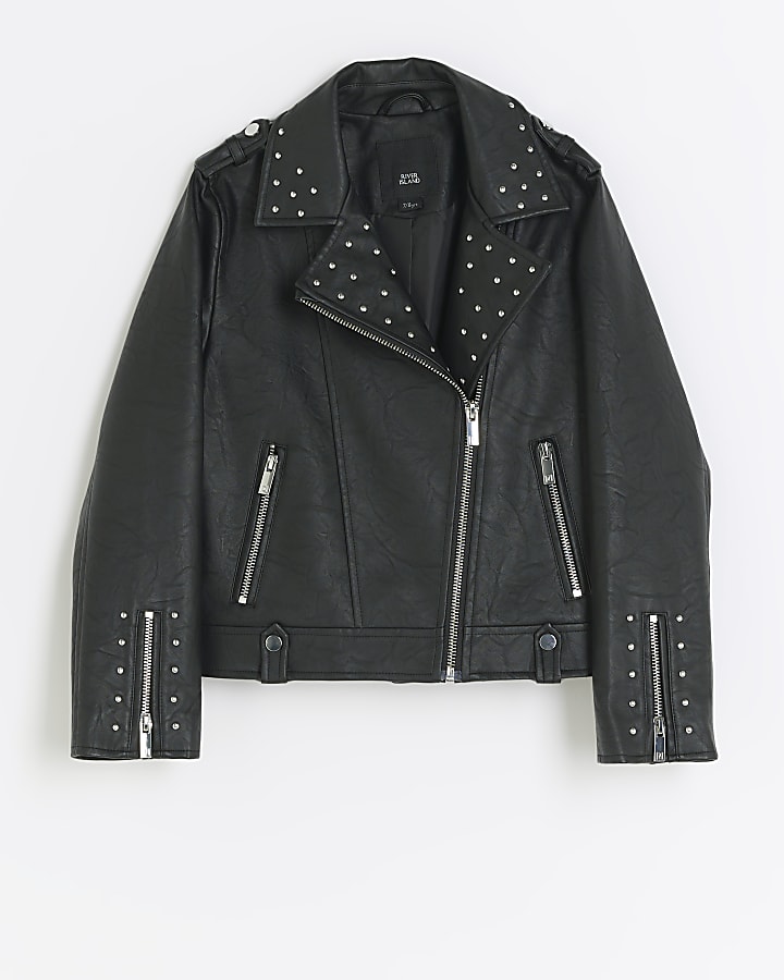 Girls black studded faux leather biker jacket River Island Very well made.
