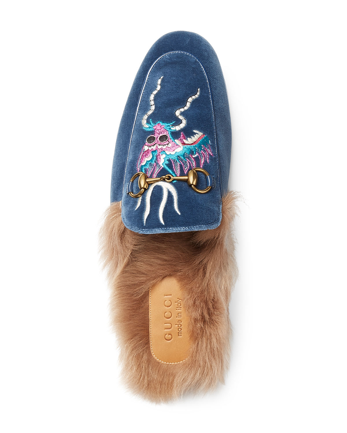 Gucci Princetown Velvet Embroidered Fur Lined Slipper Blue Very well made.