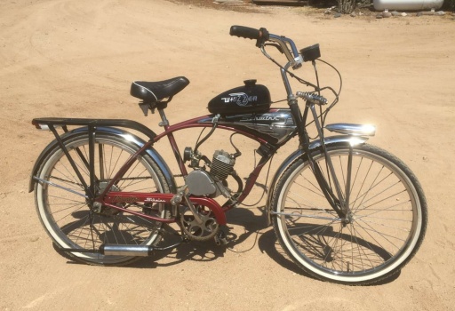 Solve 1950 Whizzer replica on a 1995 Schwinn Black Cherry Phantom right side jigsaw puzzle online with 88 pieces Very well made.