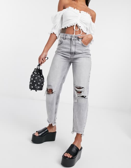 Bershka Mom jeans med huller og slidt kant i gra vask Very well made.