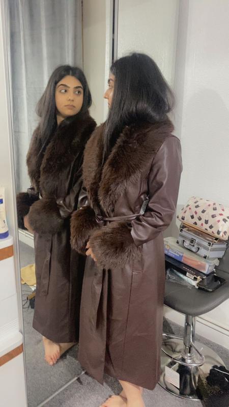 Dark Brown Leather Look Faux Fur Trim Belted Coat New Look Very well made.