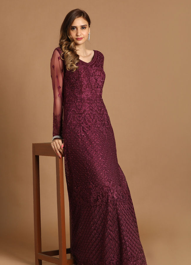 Buy Dazzling Wine Party Wear Gown Online in the USA Mohey Indo Western for Women Very well made.