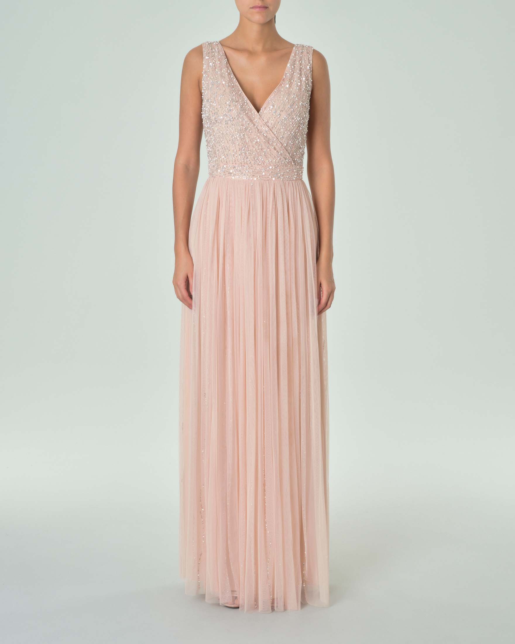 Abito lungo rosa in tulle con corpetto smanicato ricami in perline tono su tono e paillettes argento Very well made.