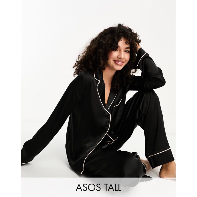 ASOS DESIGN Tall satin long sleeve shirt trouser pyjama set in black ASOS Very well made.
