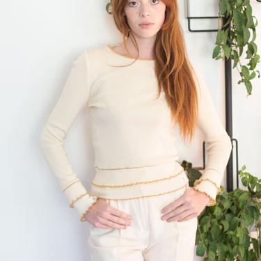 Vintage CHANEL CC Logo Cream Sweater with Gold Ruffle Trim Backroom Clothing Los Angeles CA Very well made.