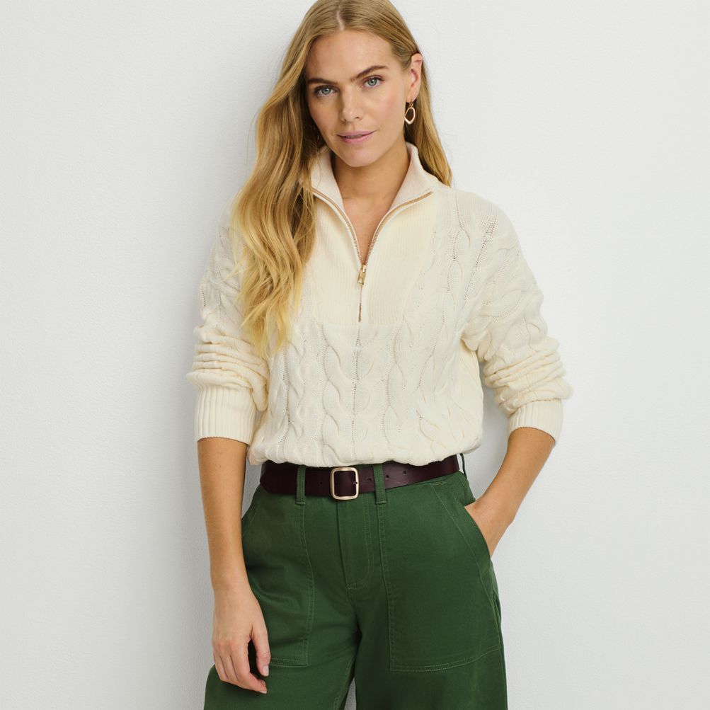 Women s Drifter Cable Quarter Zip Sweater Lands End Very well made.