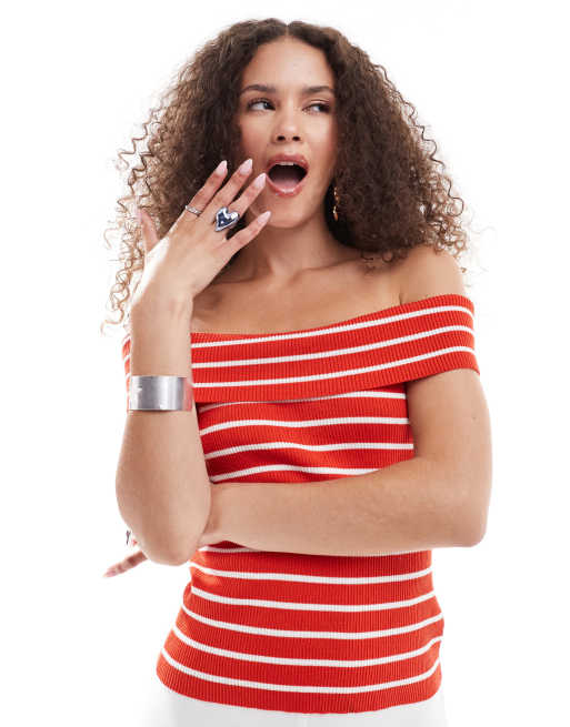Monki ribbed knitted off the shoulder bardot top in red and white stripe Very well made.