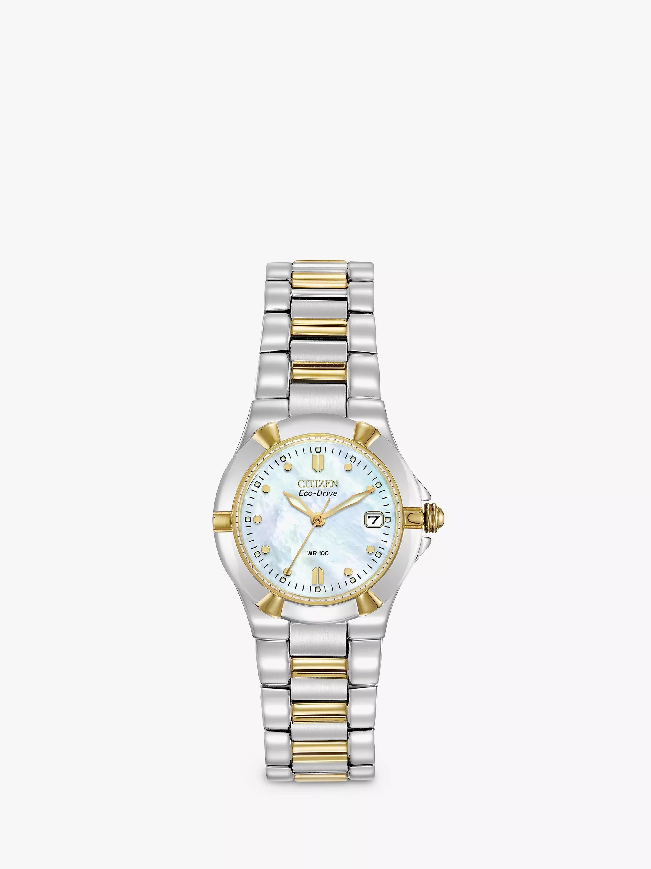 Citizen EW1534 57D Women s Eco Drive Mother of Pearl Two Tone Bracelet Strap Watch Silver Gold Very well made.