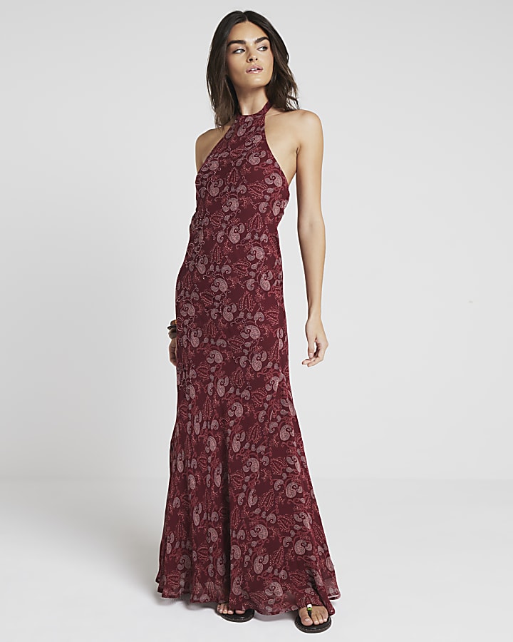 Red floral halter neck bodycon maxi dress River Island Very well made.