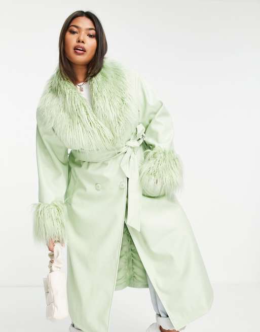 ASOS DESIGN Curve faux leather belted coat with borg trim in pistachio Very well made.