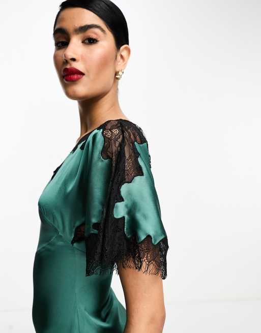 ASOS DESIGN one shoulder satin midi dress with split in dark green with contrast lace Very well made.