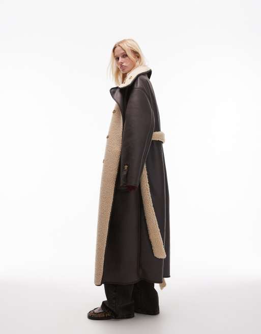 Topshop Faux Leather Oversized Shearling Trench Coat in Dark Brown Very well made.