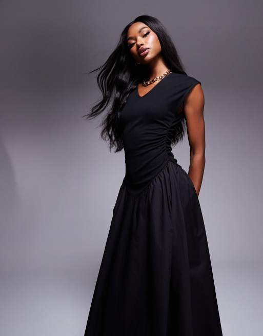 ASOS DESIGN Robe froncee mi longue avec col V et jupe evasee en popeline Noir ASOS Very well made.
