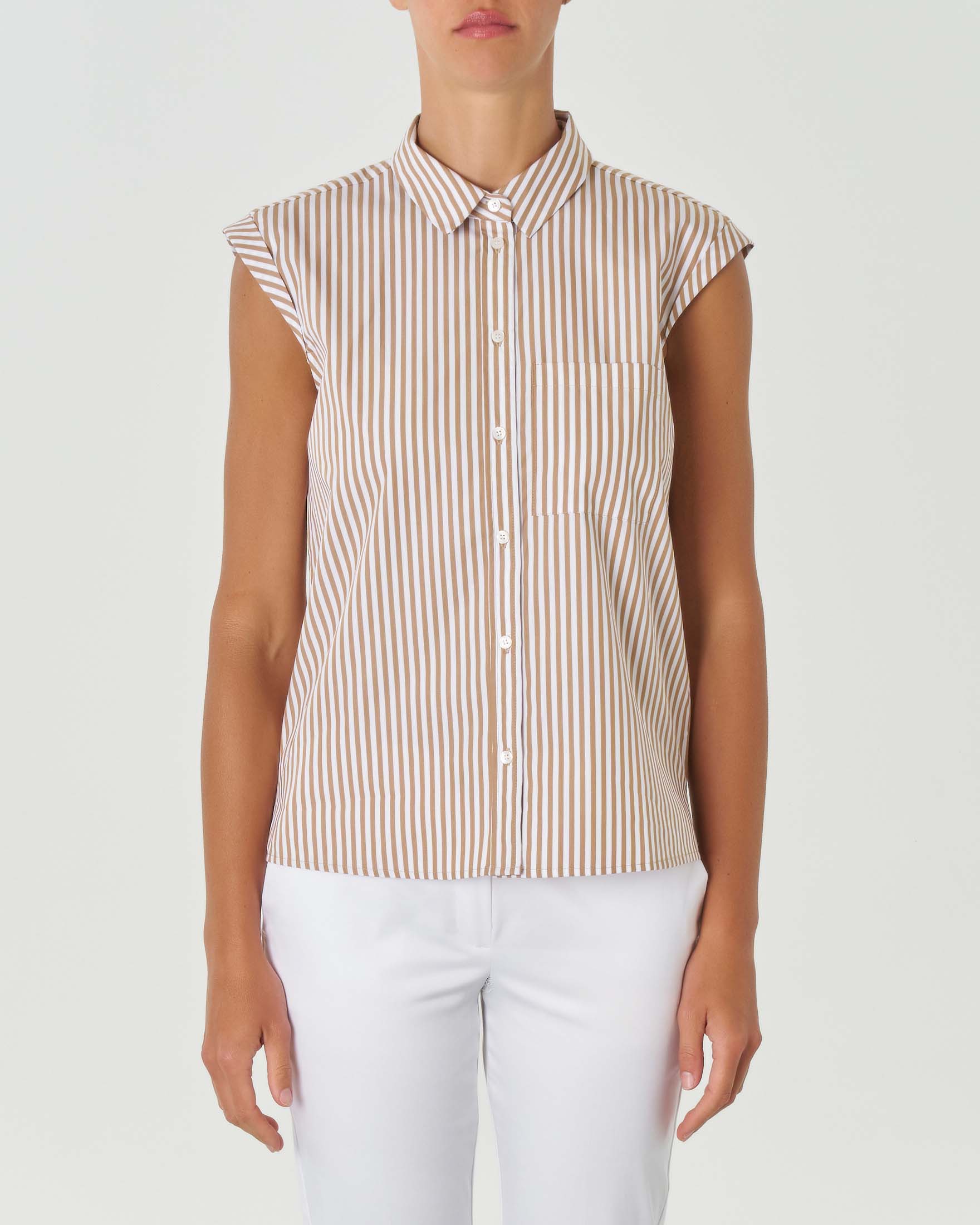 Camicia bianca in popeline di cotone a righe beige con maniche ad aletta e taschino sul petto Very well made.